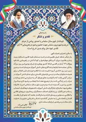 متن پیام قدردانی و تشکر فرماندار از حضور دشمن شکن مردم شهید پرور و همیشه در صحنه شهرستان سلماس- جمعه 13 آبان 1401 ساعت 15:00