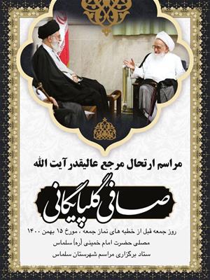 مجلس ترحیم و بزرگداشت حضرت آیت الله صافی گلپایگانی همراه با مراسم بزرگداشت شهداء روحانی و روحانیون متوفای شهرستان سلماس فردا جمعه 15 بهمن قبل از نماز جمعه در مصلی امام خمینی رحمه الله علیه برگزار میگردد.- پنج شنبه 14 بهمن 1400 ساعت 14:05