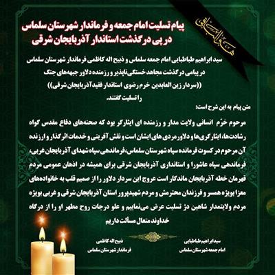 پیام مشترک حجت الاسلام والمسلمین سید ابراهیم طباطبایی امام جمعه سلماس و ذبیح اله کاظمی فرماندار سلماس در پـی درگذشت آقای "زینالعابدین رضوی خرم" استانـدار استان آذربایجــان شرقـی و فرمانـده اسبــق سپــاه شهداء استــان آذربایجان غـربـی- یکشنبه 1 بهمن 1402 ساعت 11:45