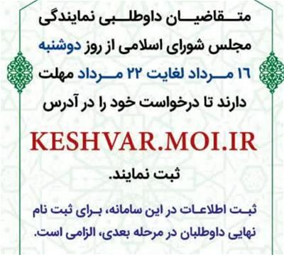 متقاضیان داوطلبی نمایندگی مجلس شورای اسلامی از روز دوشنبه 16 مرداد لغایت 22 مرداد مهلت دارند تا درخواست خود را ثبت نمایند.