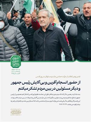 🔺تقدیر رهبر معظم انقلاب از حرکت حماسی ملت و مسئولان در روز قدس؛ «از حضور انسجامآفرین و بیآلایش رئیس جمهور و دیگر مسئولین در بین مردم تشکر میکنم»