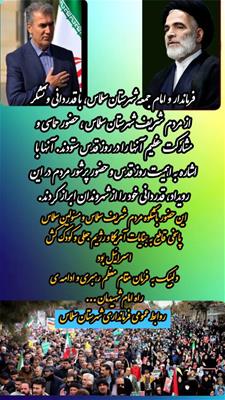 علائی فرماندار و امام جمعه شهرستان سلماس، با قدردانی و تشکر از مردم شریف شهرستان سلماس، حضور حماسی و مشارکت عظیم آنها را در روز قدس ستودند.